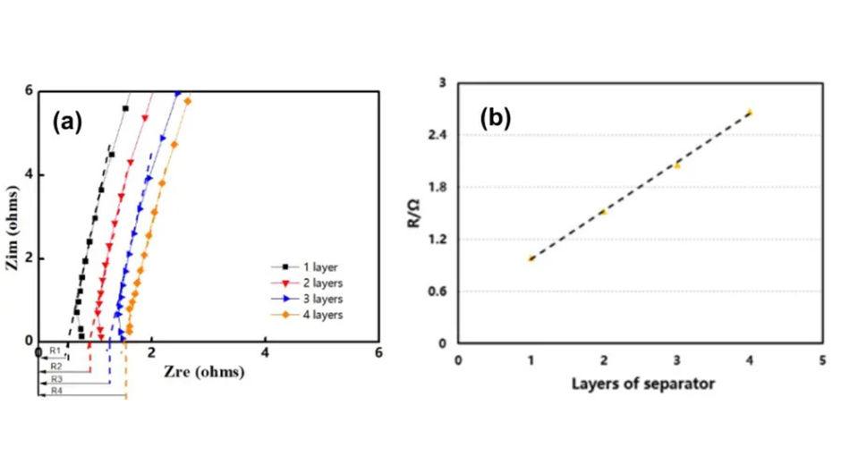 Figure 2. EIS impedance spectra for different separator layers (a); R-value fitting graph (b)