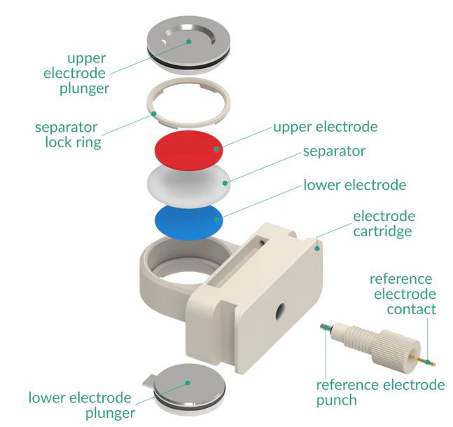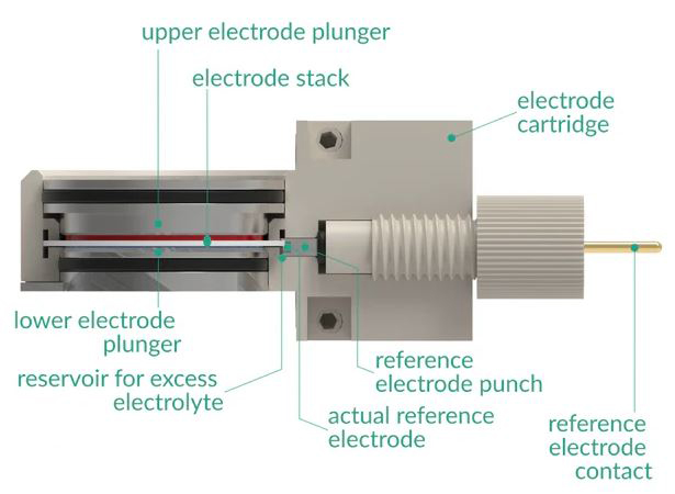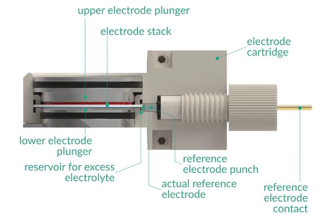· Punch-type reference electrode는 전극 카트리지 측면에 장착되며, 펀치의 날카로운 모서리를 통해 metal foil을 쉽게 절단 및 셀에 장착