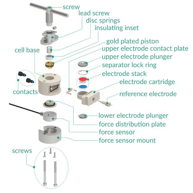 · 3-electrode battery test cell 을 이용해 제어된 압축 환경에서 배터리, 슈퍼커패시터의 전기화학적 측정을 위한 cartridge로, CV 측정 및 EIS 실험에 사용