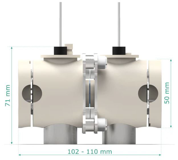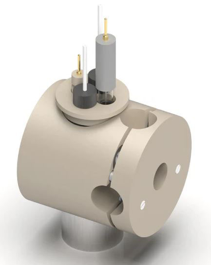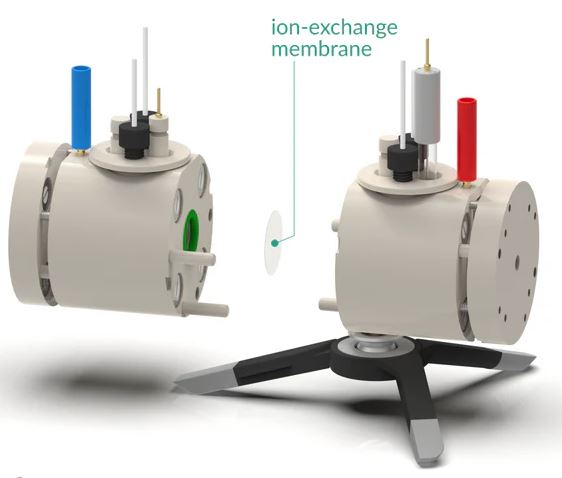 · 각각 electrolyte-inlet, electrolyte-outlet을 갖춘 두 개의 chamber로 구성되어 있으며, 이온교환막에 의해 분리 가능(이온교환막은 별도 구매 요망).